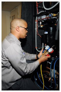 The refrigerant charge is checked by measuring temperature differential and determining electrical demand on the compressor or by reading the pressure gauges. A low or high refrigerant charge can easily go unnoticed and increase operating costs. An improper charge can also cause compressor shut-down. Periodic checks on refrigerant levels can lower your energy bills and prevent future repairs.